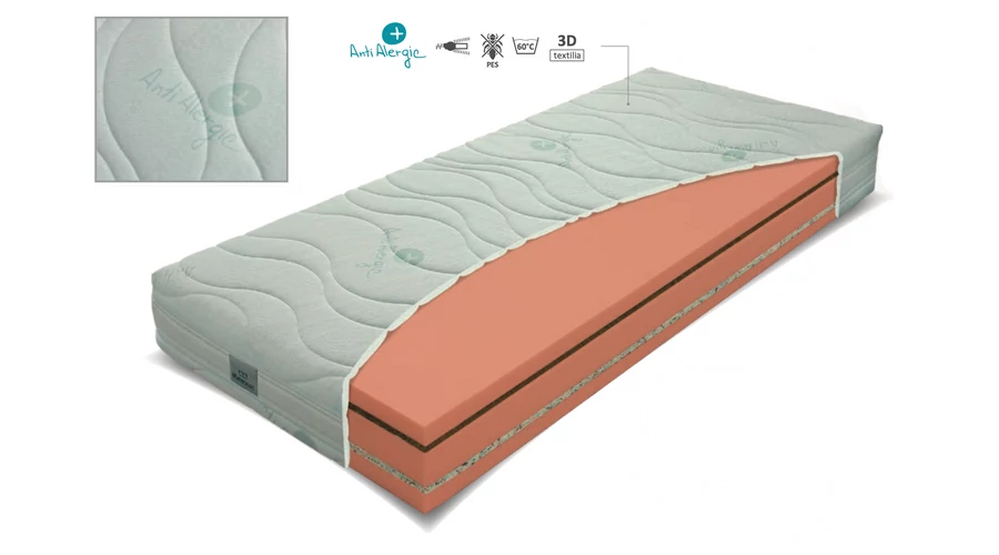 23 cm magas, félkemény, kemény, kétoldalas, különböző keménységű matrac a magas komfort érdekében. Az ortopédikus, pontrugalmas habból készített fekvőfelületek között a gerincnek határozott, de eltérő stabilitású alátámasztást nyújtó rétegekből épül fel. A ANTI ALERGIC huzat antibakteriális jellegű. 60 fokig mosható. A felhasznált alapanyagok gátolják a baktériumok és atkák szaporodását 3D oldalszellőzéssel.