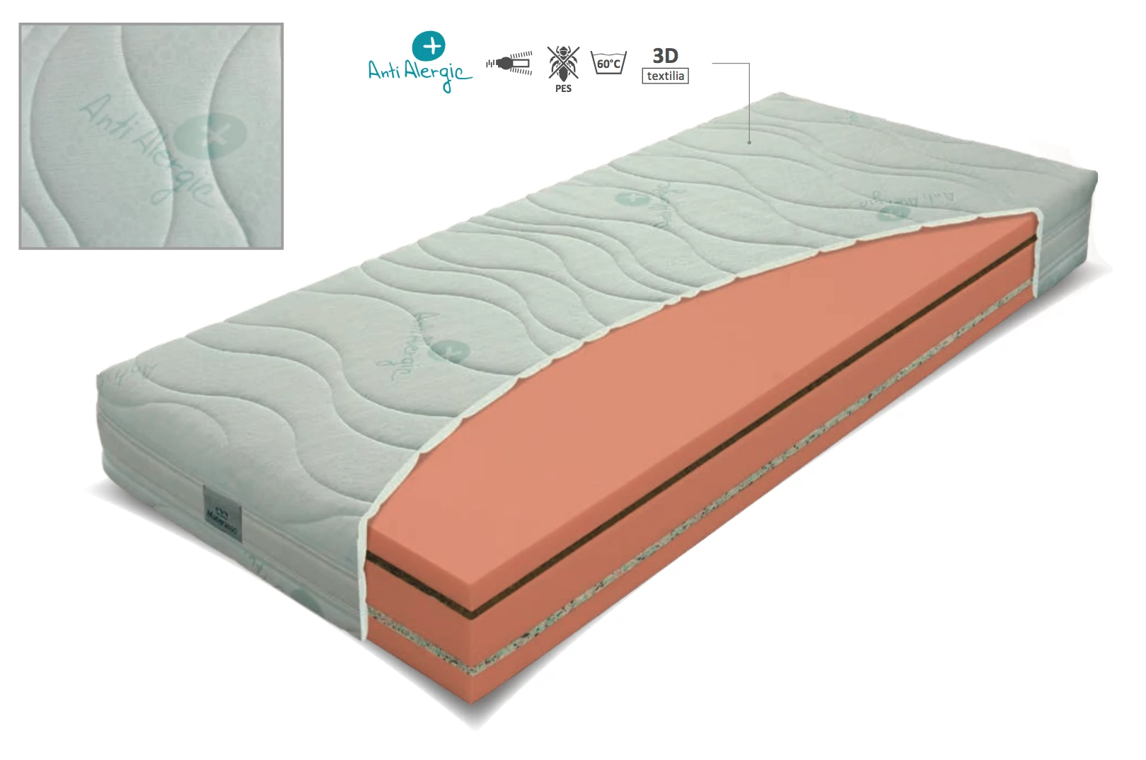 ANTI ALERGIC huzat nagy szilárdságú bevonat kiváló teljesítmény/ár arány mellett. A nagy szilárdság garantálja, hogy ellenáll a nagyon gyakori mosásnak és egyúttal fenntartja a tiszta, allergiás környezetet a matracban. A bevonat nagyon kényelmes tapintással és varrással az üreges PES szálakkal biztosítja a felhasználónak a jó termikus kényelmet. Alapvető higiéniát biztosít a matrac számára, felszívja a felesleges nedvességet, és a legszélesebb körű fogyasztók számára is alkalmas.