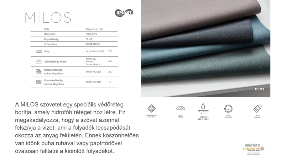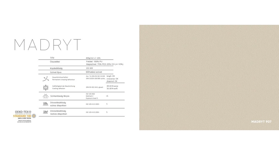 A szék szerkezete tömör, laminált, ragasztott rugalmas fából készült, ami biztosítja a nagy szilárdságot. A kárpit színe és típusa választható A rugós ülőfelület hosszú távú állandó kényelmet biztosít.