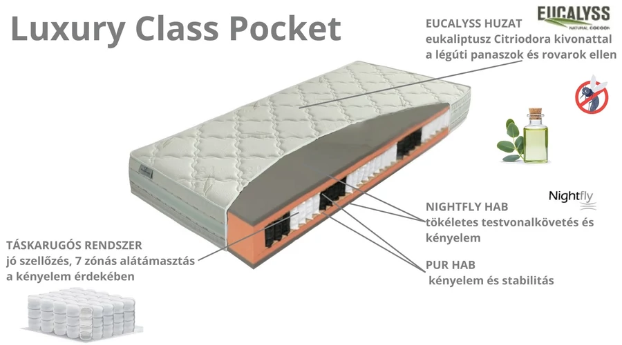Felsőkategóriás 5 csillagos szállodai kényelem már az Ön otthonában! Luxus kategóriájú 32 cm-es 7 zónás, táskarugós matrac. A matrac alsó és felső részén 3 cm Nightfly hab található, mely az ágybetét kényelmi szintjét fokozza. Levehető és max. 60°C-on mosható Eucalyss huzat fedi eukaliptusz (Citriodora) kivonattal, mely kellemes, kényelmes, antibakteriális és légúttisztító hatású, így különösen ajánlott asztmában szenvedők számára.