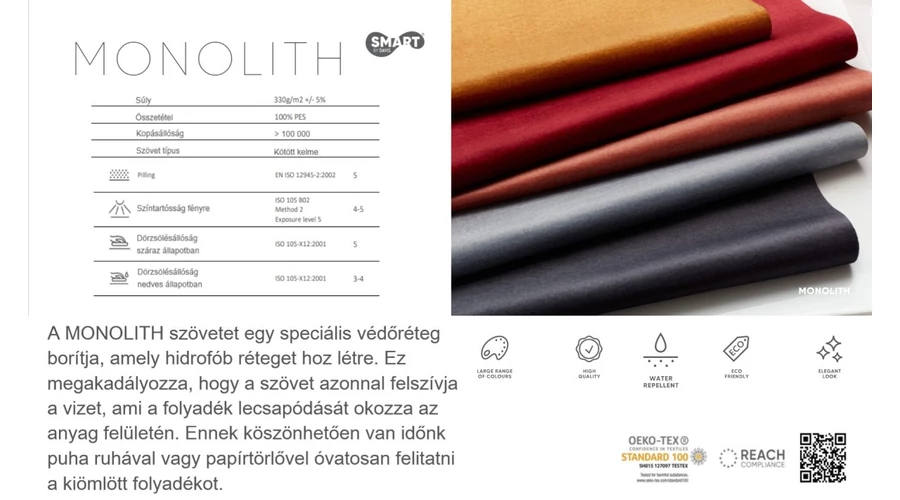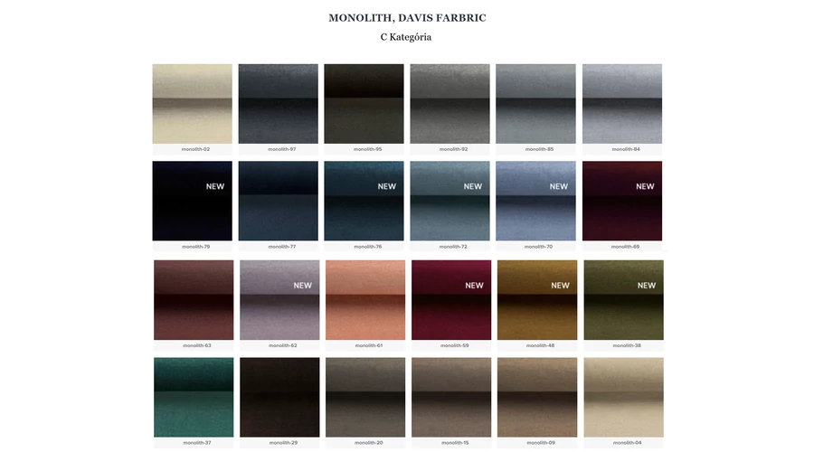 4 féle árkategóriájú szövetből rendelhető, kategóriánként több, mint 60 színben. Szövetválaszték megegyezik a Materasso által gyártott ágyakéval, így megteremtheti hálószobája teljes összhangját.